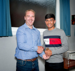 Jamie Nowell receives his award from Mark Farrell (left) while Mark also does the honours for Peter Janampally (below)
